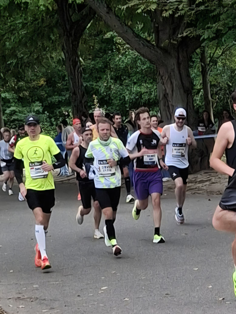 Der erste Kilometer aus dem Stadion raus war Zick Zack laufen und mein Tempo finden. Nach dem ersten Kilometer hatte ich dann endlich freie Bahn und konnte konstant laufen. Durch die gute Stimmung am Rand beflügelt war der zweite Kilometer etwas schneller als geplant. Dazu kam der Schock, als die Uhr sich meldete, dass ich schon 2 Kilometer gelaufen wäre, die offizielle Anzeige allerdings noch knappe 100 Meter weg war. Es stand also schon fest, ich werde mal wieder extra Meter sammeln. Trotz eines guten Gefühl bei dem höheren Tempo, ließ ich noch Vorsicht walten, da es zu dieser Uhrzeit noch recht kalt war, was ich auch beim Atmen gemerkt habe.